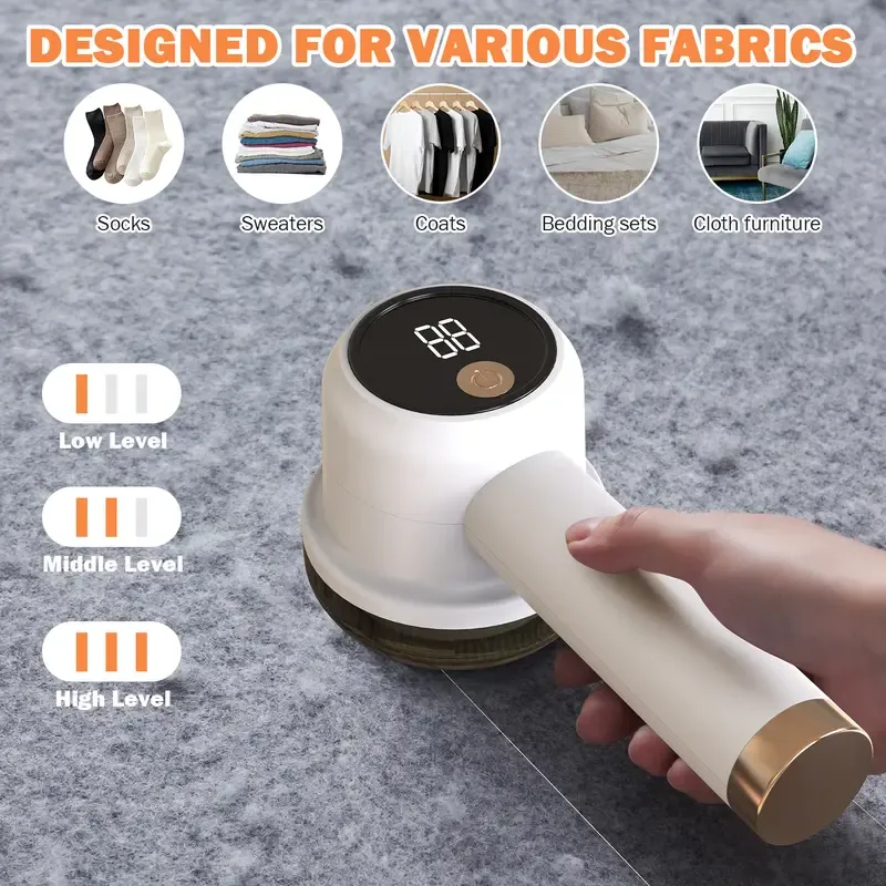 Rechargeable Fabric Shaver, includes 1 blade head, 3-speed settings, and LED display.
